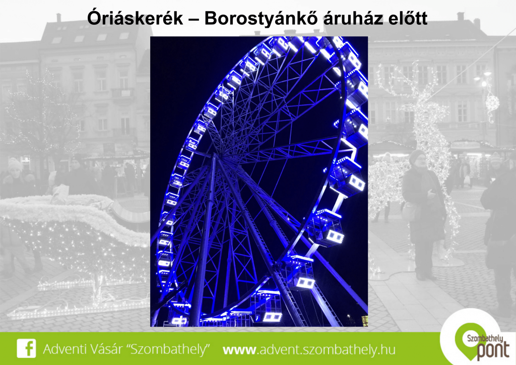 Óriáskereket is felállítanak az idei adventre: több hetes felmérés alapján, a hivatal munkatársai és a kerék üzemeltetői úgy döntöttek, hogy a Borostyánkő Áruház előtt állítják fel majd az új látványelemet. November 19-től zárják le azt a 29 parkolóhelyet, amit az óriáskerék felállítására használnak majd. Horváth Soma alpolgármester felhívta a figyelmet, hogy a kieső parkolókapacitást az áruház mögötti parkolók pótolni tudják, hiszen ez a terület felmérések szerint 60-70 %-os kihasználtsággal működik.