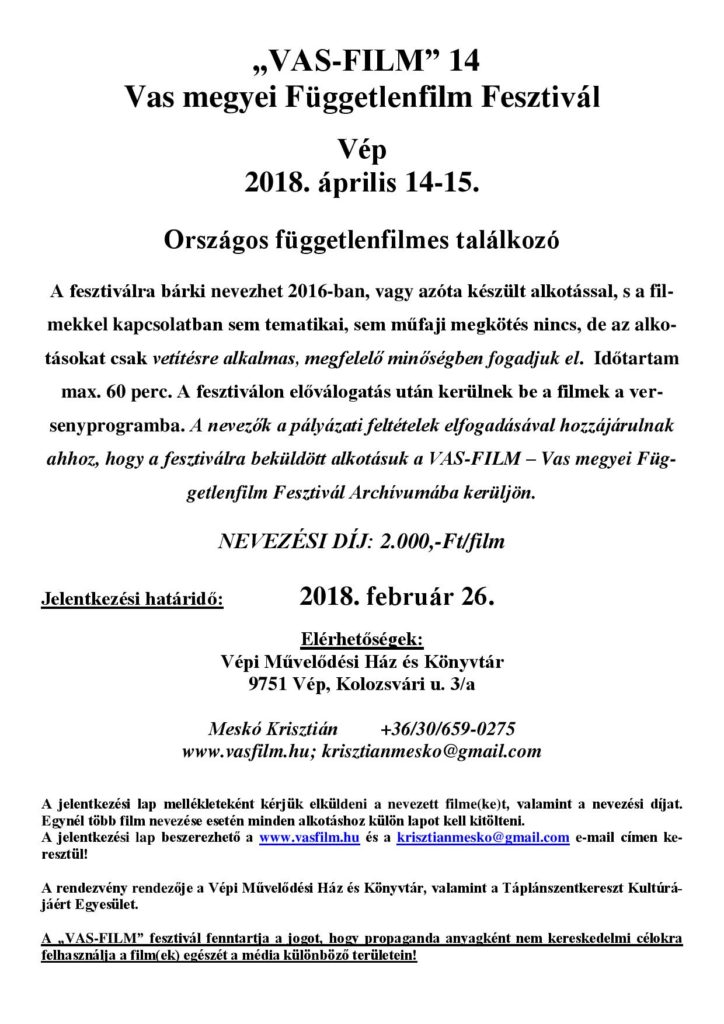 A jelentkezési lap beszerezhető a www.vasfilm.hu és a krisztianmesko@gmail.com e-mail címen keresztül!